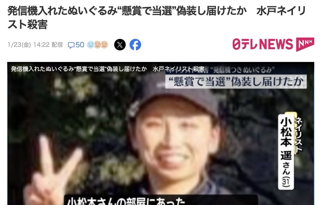 この事件では、殺害された小松本遥さんの部屋にあった人気キャラクターのぬいぐるみから発信機が見つかっていたことがわかっています。ぬいぐるみは小松本さんを受取人として、事件の数日前に小松本さんの実家に届けられていました。