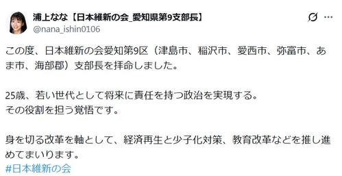 翌22日には、維新が浦上氏を衆院選の公認候補としたことを発表。浦上氏は同日、政治活動を報告するインスタグラムで、会見を行ったことを発表した。ジャケット姿でガッツポーズする写真や会見の写真をアップし「本日は衆院選の公認候補予定者発表記者会見を名古屋市役所市政記者クラブ会見場にて行いました!緊張もありましたが、改めて覚悟が固まりました。若い世代の声、そして皆様のお声を国政に届けるため、全力で挑戦してまいります」と決意をつづった。