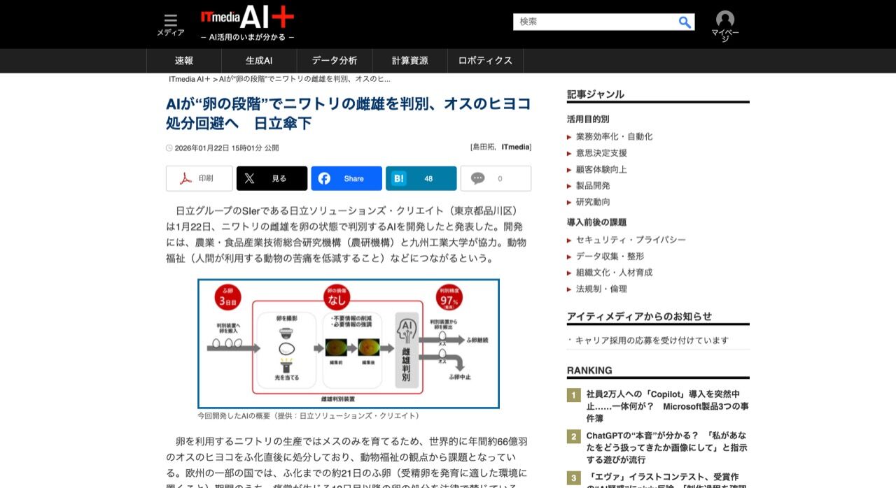 日立グループのSIerである日立ソリューションズ・クリエイト(東京都品川区)は1月22日、ニワトリの雌雄を卵の状態で判別するAIを開発したと発表した。
