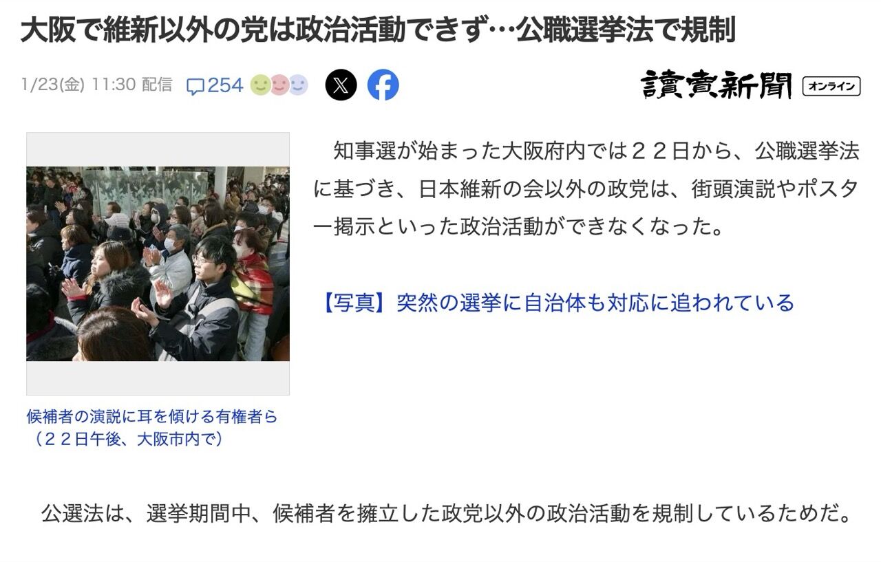 大阪で知事選始まったけど知事選で吉村が日本維新の会の候補として出馬したから