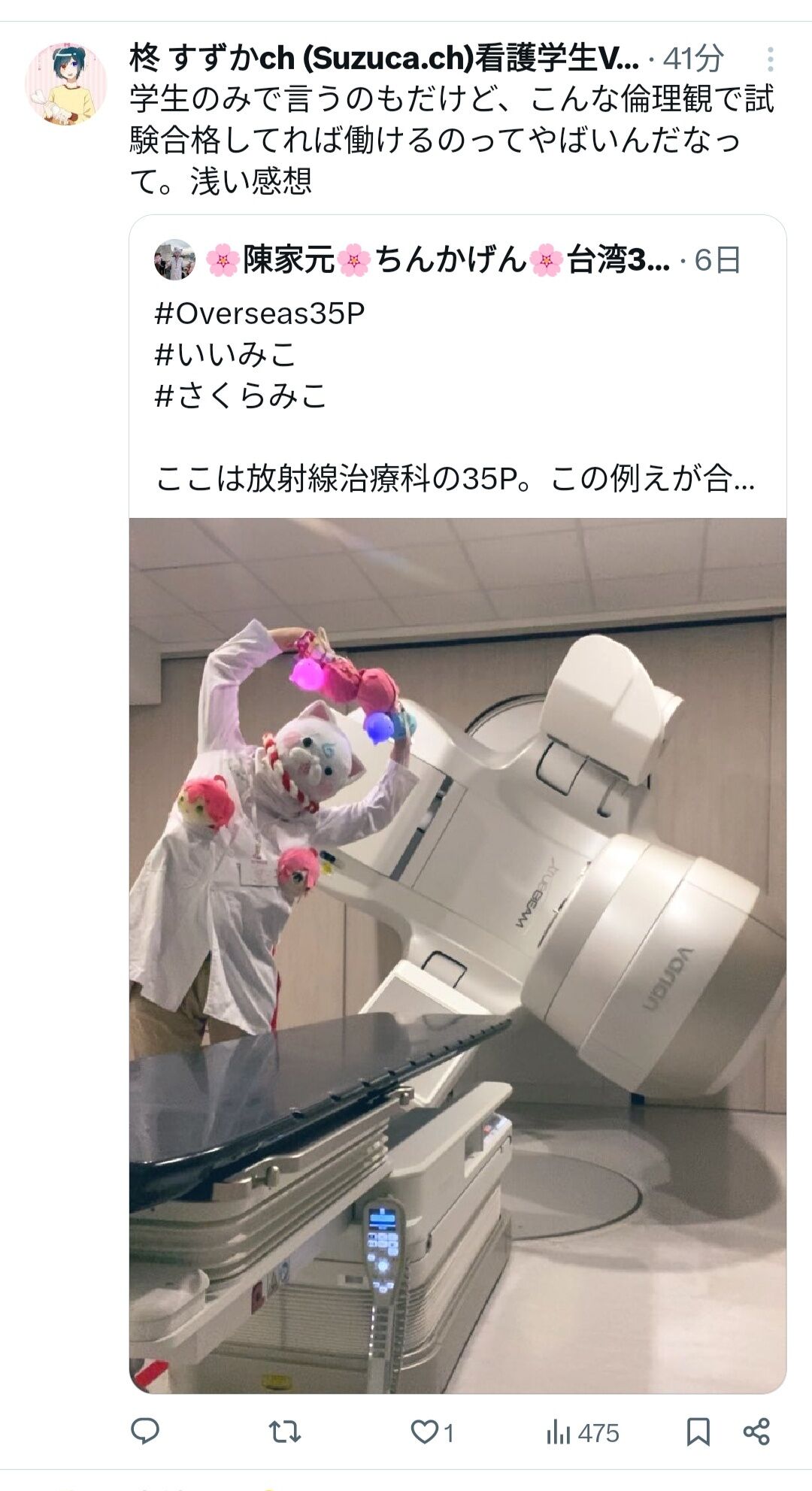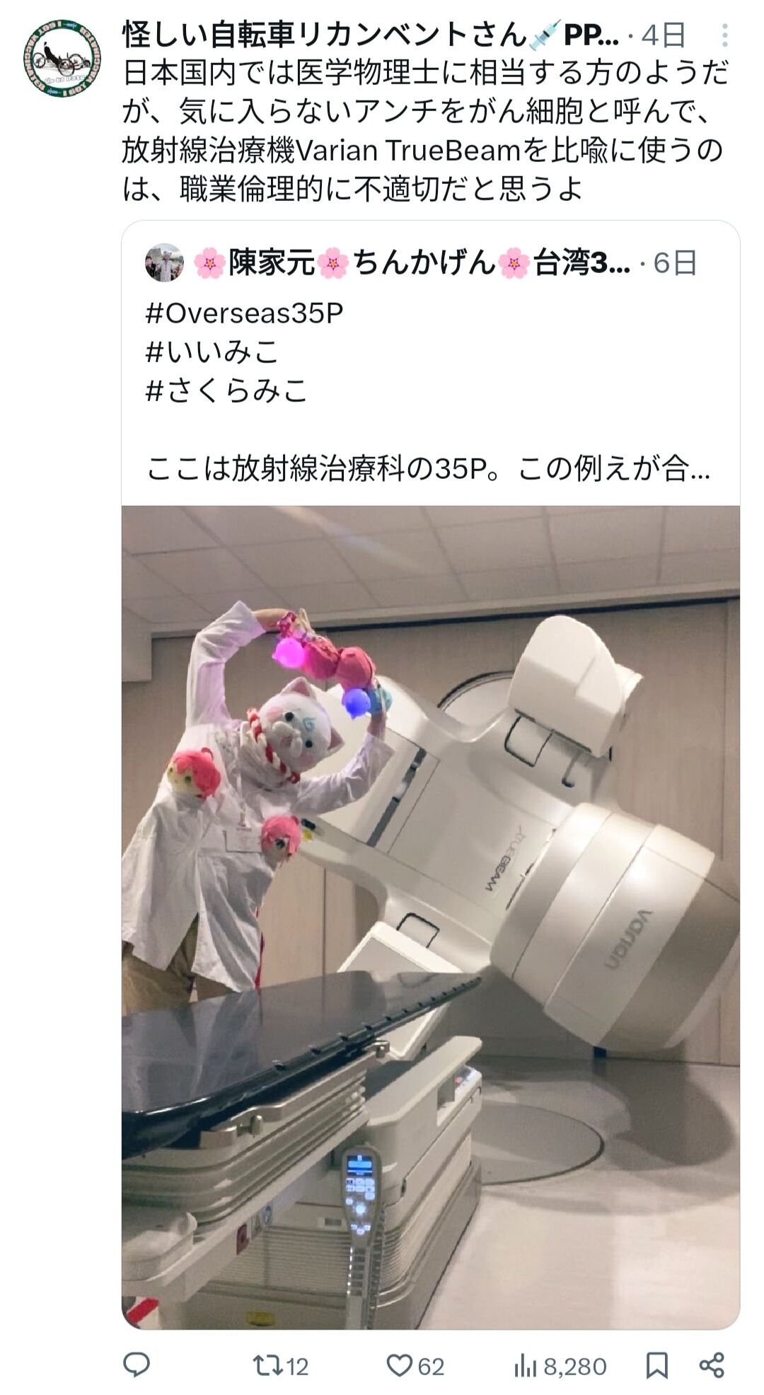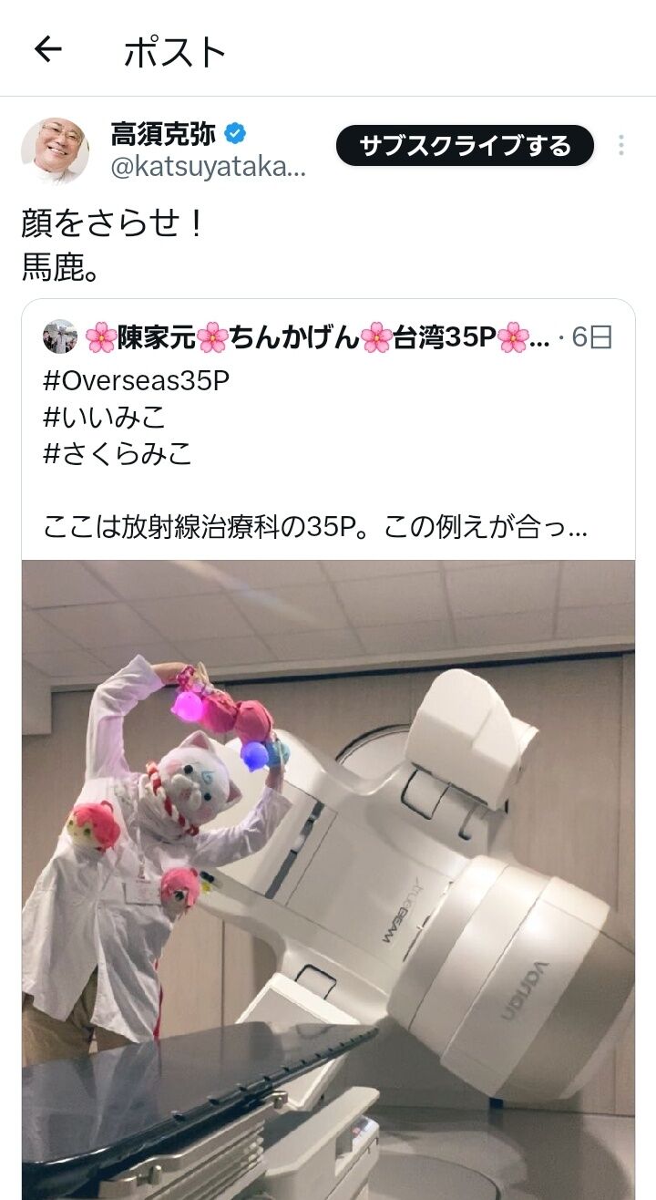 台湾放射線技師、さくらみこアンチを「がん細胞」に例え炎上 (2026/01/24 15:04:20)