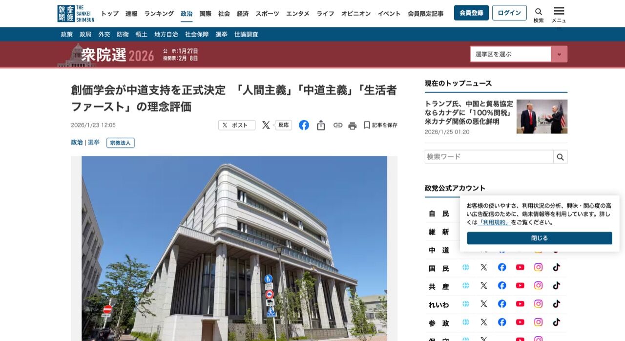 公明党の支持母体である創価学会は22日、衆院選(27日公示、2月8日投開票)への対応を協議する中央社会協議会を開き、立憲民主党と公明党が結党した新党「中道改革連合」を支持すると正式決定した。