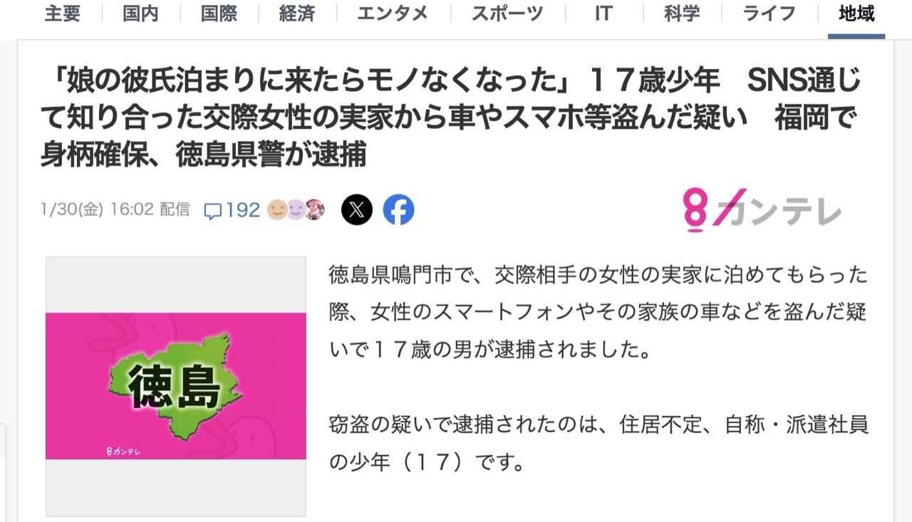 「娘の彼氏泊まりに来たらモノなくなった」17歳少年 SNS通じて知り合った交際女性の実家から車やスマホ等盗んだ疑い 福岡で身柄確保、徳島県警が逮捕