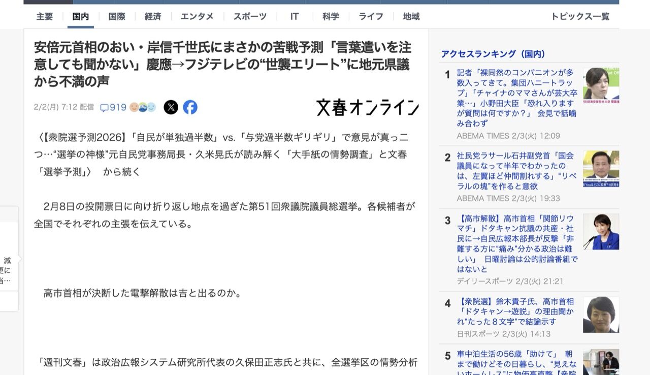 安倍元首相のおい・岸信千世氏にまさかの苦戦予測「言葉遣いを注意しても聞かない」慶應→フジテレビの“世襲エリート”に地元県議から不満の声(文春オンライン) - Yahoo!ニュース