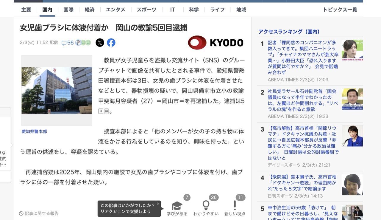 教員が女子児童らを盗撮し交流サイト(SNS)のグループチャットで画像を共有したとされる事件で、愛知県警熱田署捜査本部は3日、女児の歯ブラシに体液を付着させたなどとして、器物損壊の疑いで、岡山県備前市立小の教諭甲斐海月容疑者(27)=岡山市=を再逮捕した。逮捕は5回目。