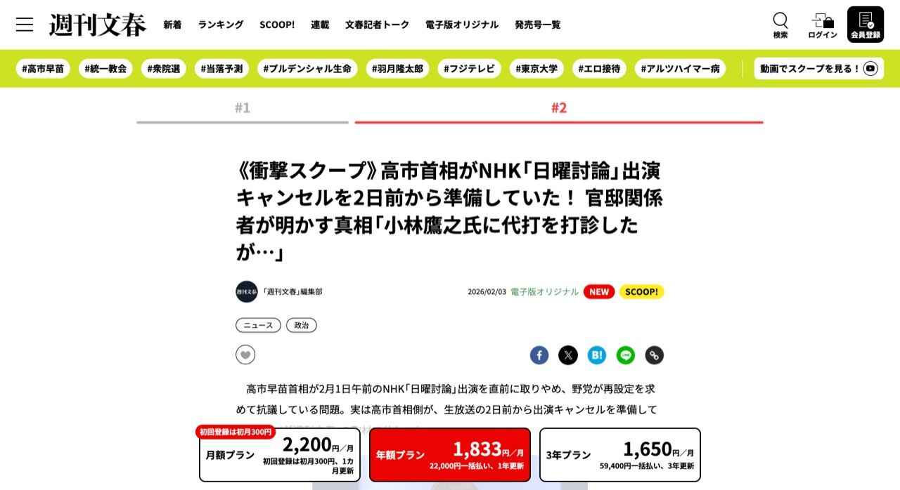 高市早苗首相が2月1日午前のNHK「日曜討論」出演を直前に取りやめ、野党が再設定を求めて抗議している問題。実は高市首相側が、生放送の2日前から出演キャンセルを準備していたことが「週刊文春」の取材で分かった。