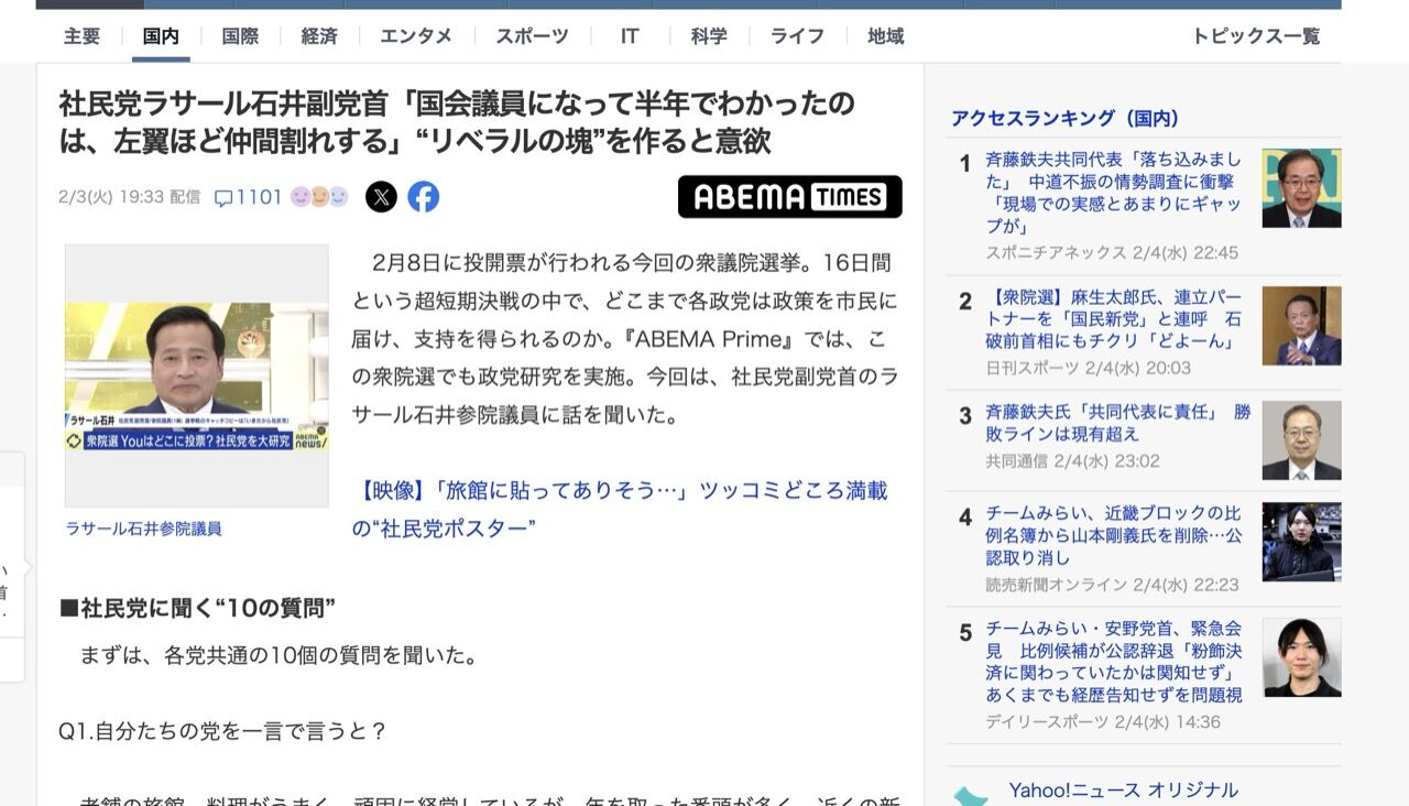 社民党ラサール石井副党首「国会議員になって半年でわかったのは、左翼ほど仲間割れする」“リベラルの塊”を作ると意欲(ABEMA TIMES) - Yahoo!ニュース