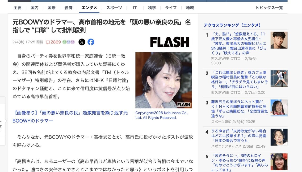 元BOOWYのドラマー、高市首相の地元を「頭の悪い奈良の民」名指しで “口撃” して批判殺到(SmartFLASH) - Yahoo!ニュース