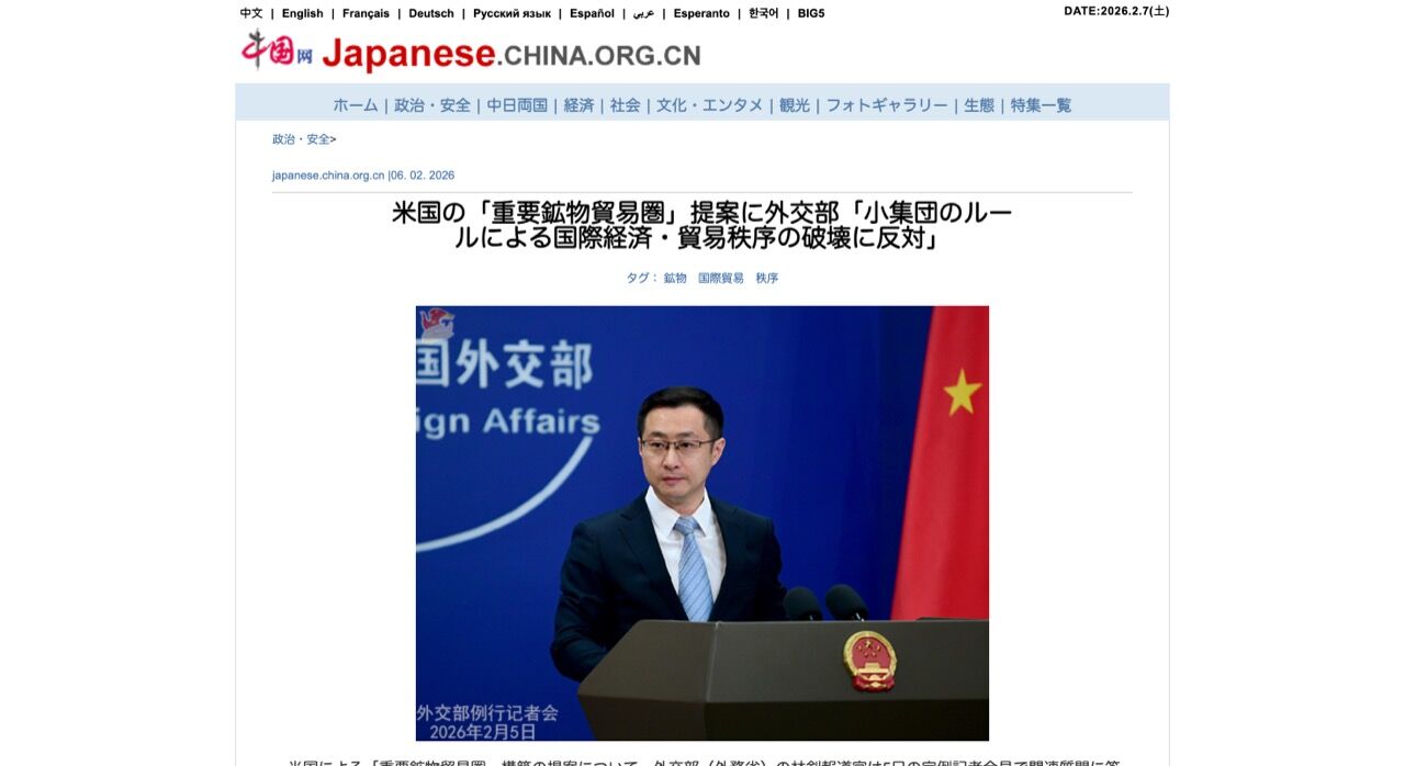 米国による「重要鉱物貿易圏」構築の提案について、外交部(外務省)の林剣報道官は5日の定例記者会見で関連質問に答えた際、「開放的で包摂的かつ広く恩恵をもたらす国際貿易環境を維持することは各国の共通利益にかない、各国には重要鉱物のグローバルな産業・サプライチェーンの安定と安全を維持するために建設的な役割を果たす責任がある。また、我々はいかなる国が『小集団』のルールで国際経済・貿易秩序を破壊することにも反対する」と表明した。