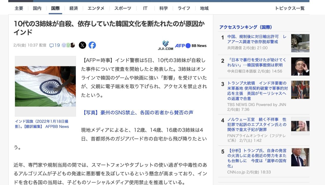 10代の3姉妹が自殺、依存していた韓国文化を断たれたのが原因か インド(AFP=時事) - Yahoo!ニュース