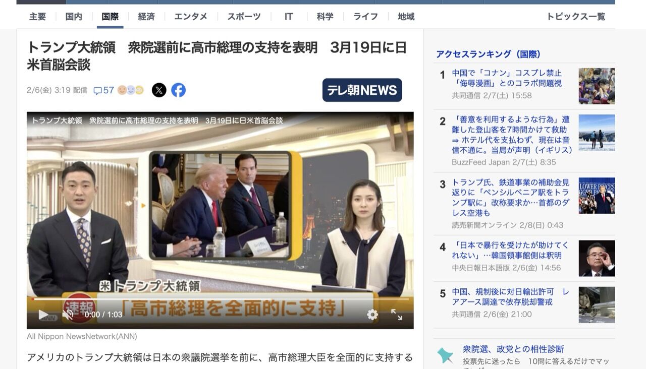 アメリカのトランプ大統領は日本の衆議院選挙を前に、高市総理大臣を全面的に支持すると表明しました。