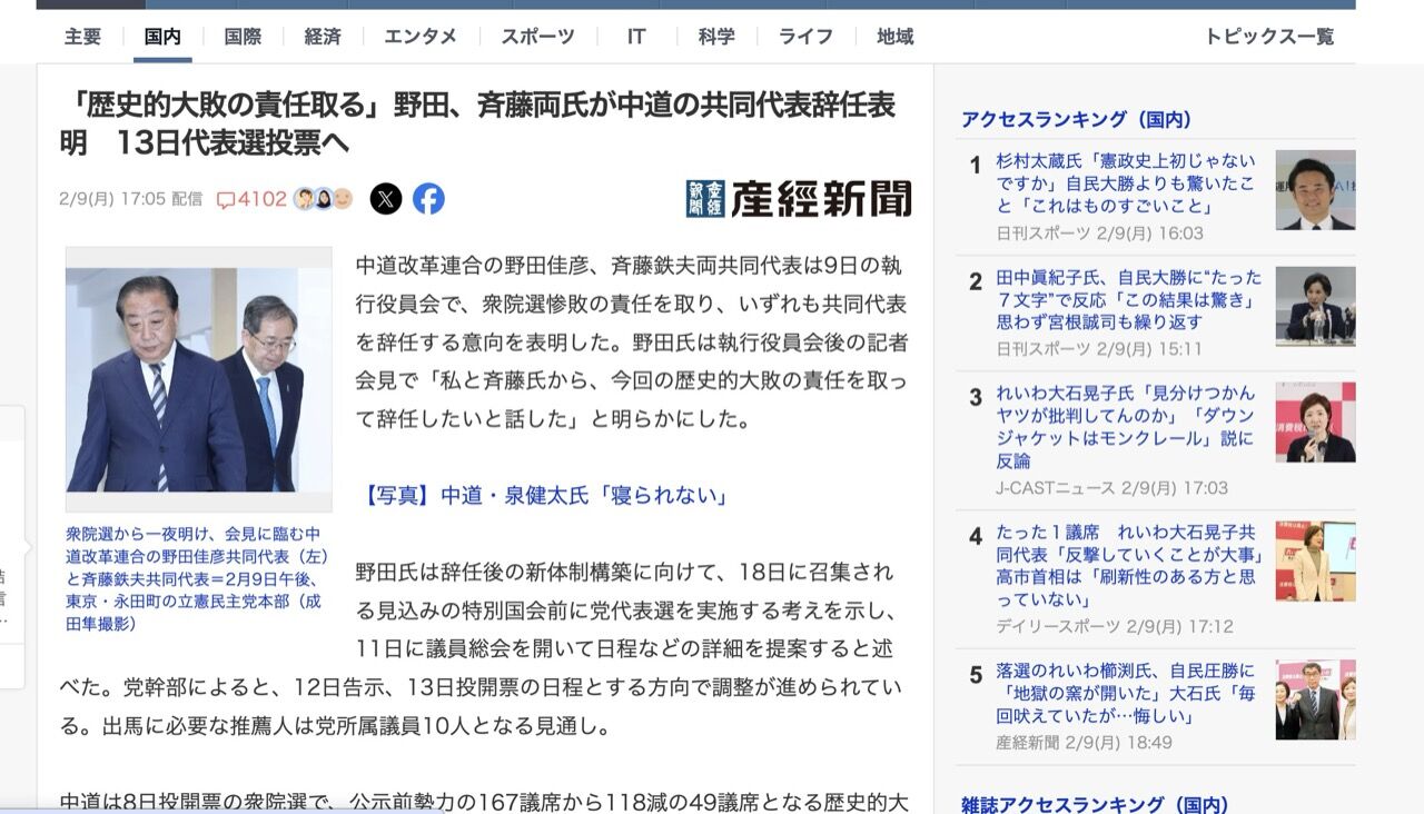 中道改革連合の野田佳彦、斉藤鉄夫両共同代表は9日の執行役員会で、衆院選惨敗の責任を取り、いずれも共同代表を辞任する意向を表明した。野田氏は執行役員会後の記者会見で「私と斉藤氏から、今回の歴史的大敗の責任を取って辞任したいと話した」と明らかにした。
