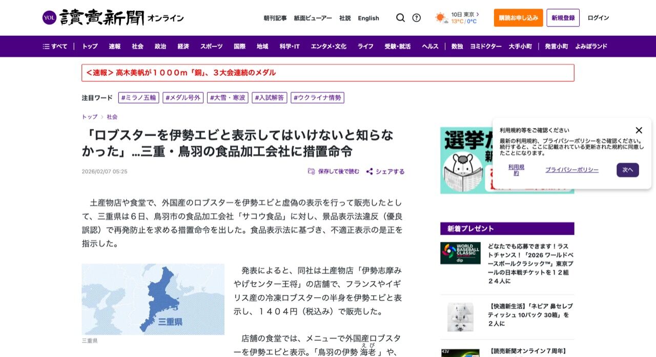 「ロブスターを伊勢エビと表示してはいけないと知らなかった」…三重・鳥羽の食品加工会社に措置命令