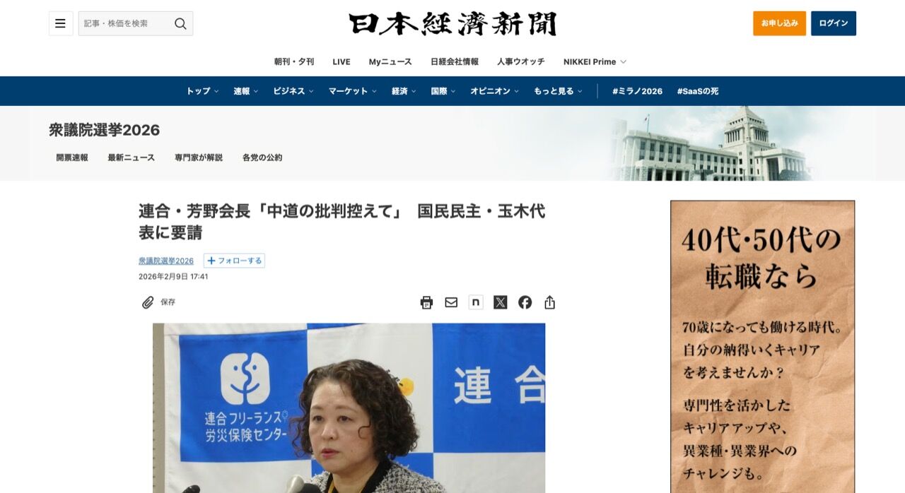 連合の芳野友子会長は9日の記者会見で、国民民主党の玉木雄一郎代表に中道改革連合の批判を控えるよう求めたことを明かした。衆院選を終えて同日に玉木氏と会談した際に伝えたという。