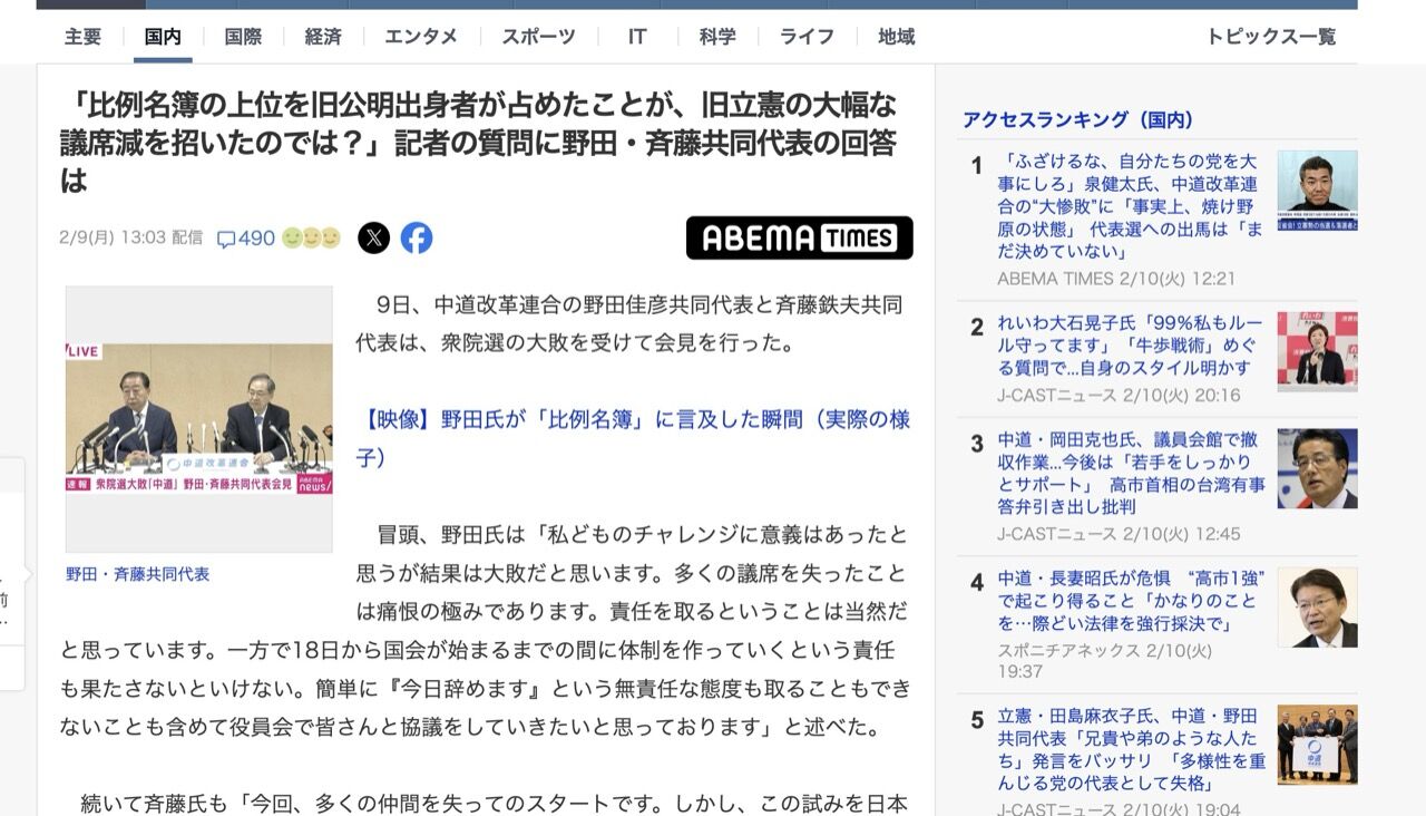 9日、中道改革連合の野田佳彦共同代表と斉藤鉄夫共同代表は、衆院選の大敗を受けて会見を行った。