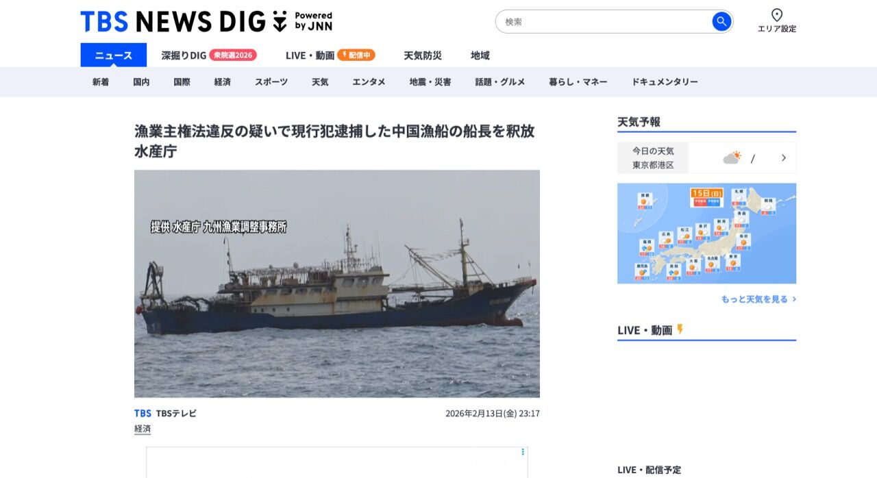 漁業主権法違反の疑いで現行犯逮捕した中国漁船の船長を釈放 水産庁