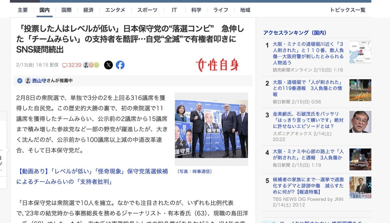 《国政政党幹部が他党に投票した有権者をレベルがかなり低いと侮辱。それがダメな事だとさえわからないレベルなのが日本保守党》