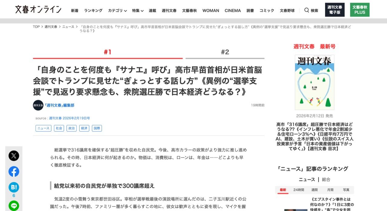 「自身のことを何度も『サナエ』呼び」高市早苗首相が日米首脳会談でトランプに見せた“ぎょっとする話し方”《異例の“選挙支援”で見返り要求懸念も、衆院選圧勝で日本経済どうなる?》 | 文春オンライン