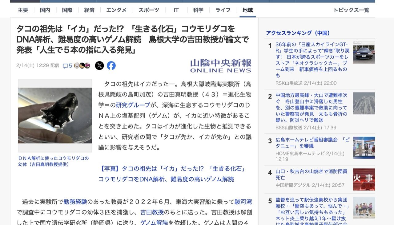 タコの祖先は「イカ」だった!? 「生きる化石」コウモリダコをDNA解析、難易度の高いゲノム解読 島根大学の吉田教授が論文で発表「人生で5本の指に入る発見」