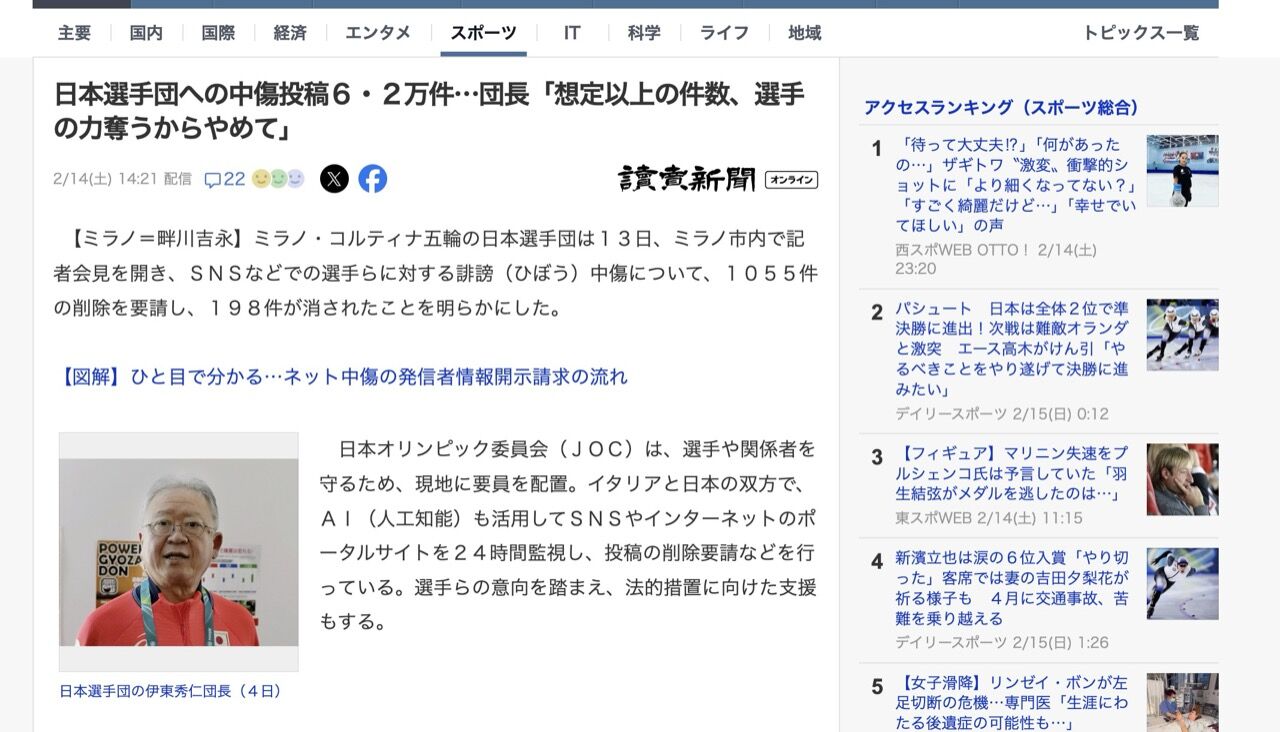 日本オリンピック委員会(JOC)は、選手や関係者を守るため、現地に要員を配置。イタリアと日本の双方で、AI(人工知能)も活用してSNSやインターネットのポータルサイトを24時間監視し、投稿の削除要請などを行っている。選手らの意向を踏まえ、法的措置に向けた支援もする。