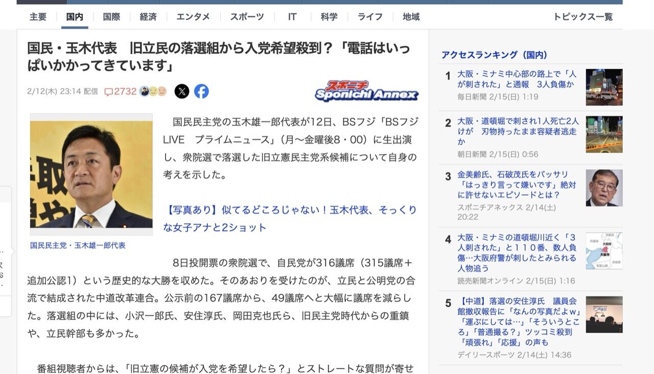 番組視聴者からは、「旧立憲の候補が入党を希望したら?」とストレートな質問が寄せられた。玉木氏は「電話はいっぱいかかってきていますけどね」とぶっちゃけ、続けた。