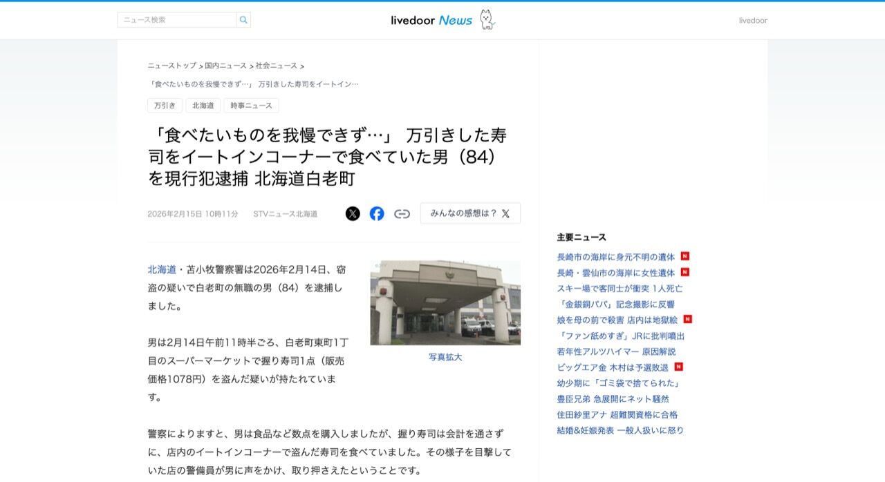 「食べたいものを我慢できず…」 万引きした寿司をイートインコーナーで食べていた男(84)を現行犯逮捕 北海道白老町 - ライブドアニュース