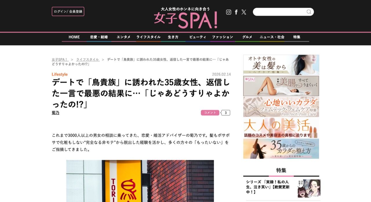 デートで「鳥貴族」に誘われた35歳女性、返信した一言で最悪の結果に…「じゃあどうすりゃよかったの!?」 « 女子SPA!