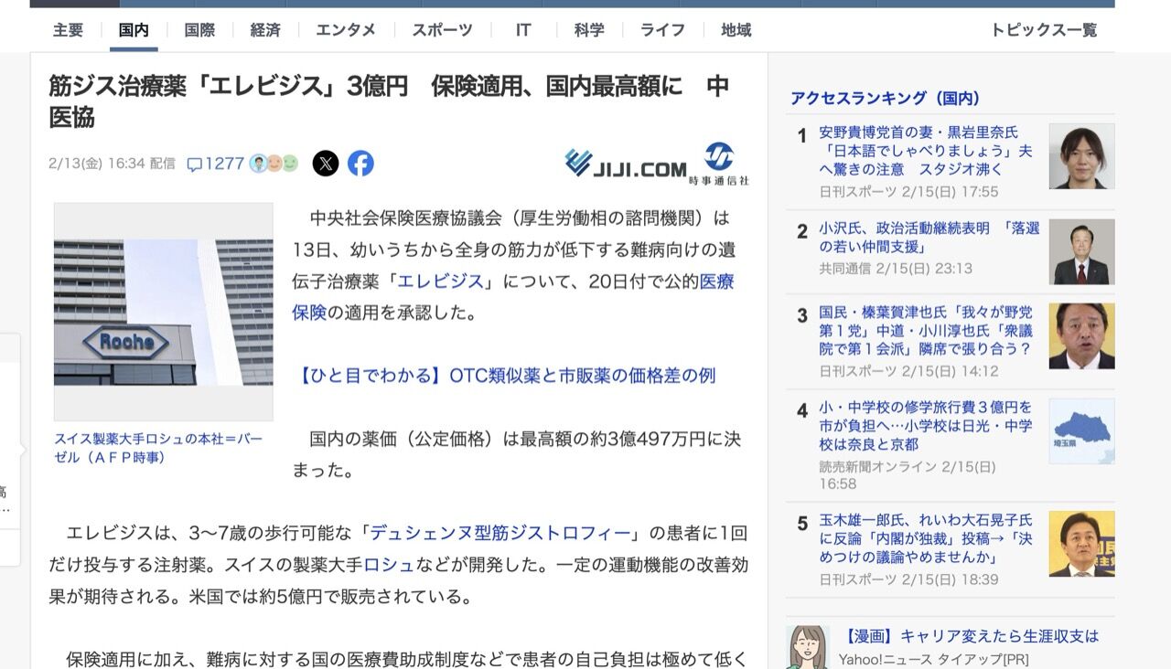 国内の薬価(公定価格)は最高額の約3億497万円に決まった。