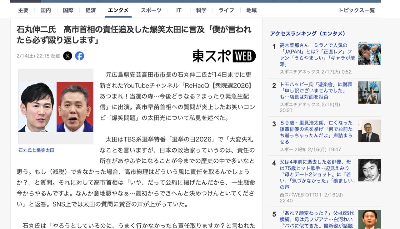 「僕が言われたら、めっちゃ仕返ししますけどね。『今、なんとおっしゃいました?逆に質問しますけど』って必ず殴り返しますけど。高市さんは優しいし、紳士だから…。それはいいんです。責任が取れる立場にあるのは事実です。だからその力を正しく行使してほしいなと思います」と話した。