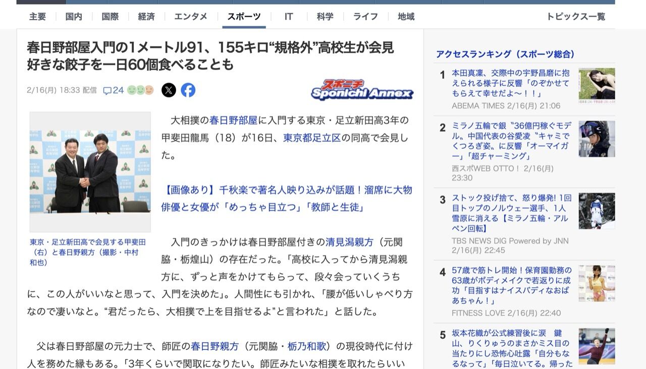 大相撲の春日野部屋に入門する東京・足立新田高3年の甲斐田龍馬(18)が16日、東京都足立区の同高で会見した。