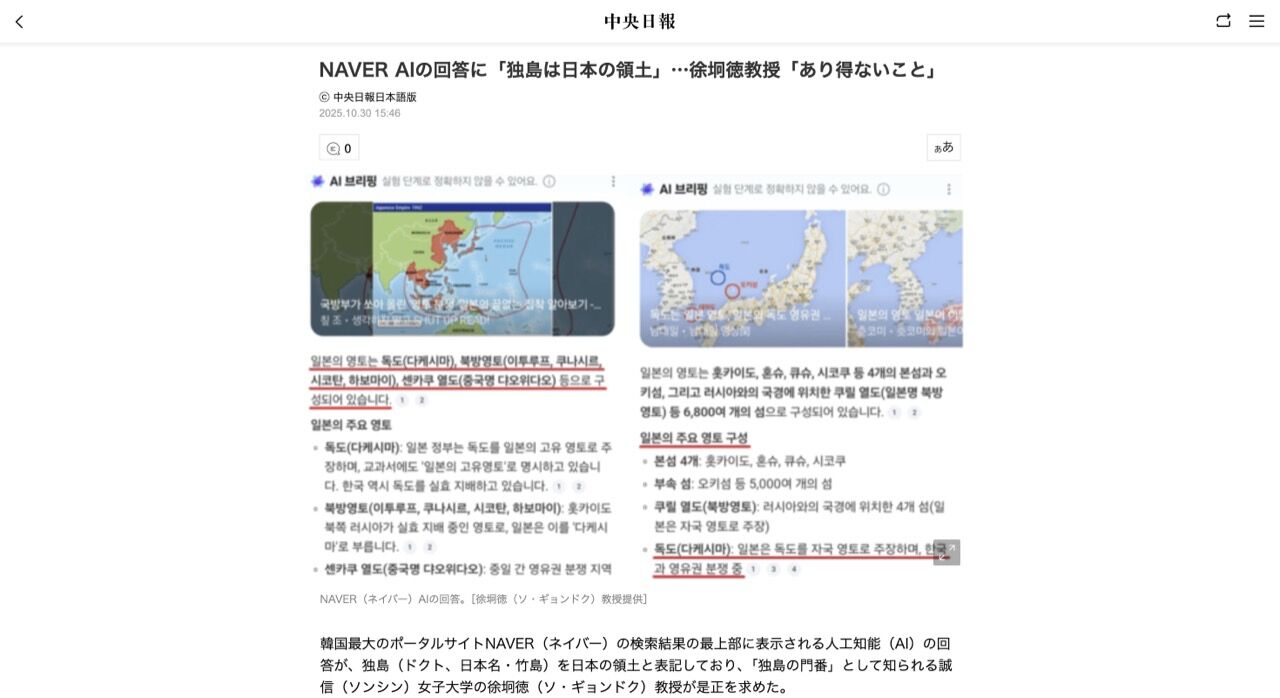 韓国最大のポータルサイトNAVER(ネイバー)の検索結果の最上部に表示される人工知能(AI)の回答が、独島(ドクト、日本名・竹島)を日本の領土と表記しており、「独島の門番」として知られる誠信(ソンシン)女子大学の徐坰徳(ソ・ギョンドク)教授が是正を求めた。
