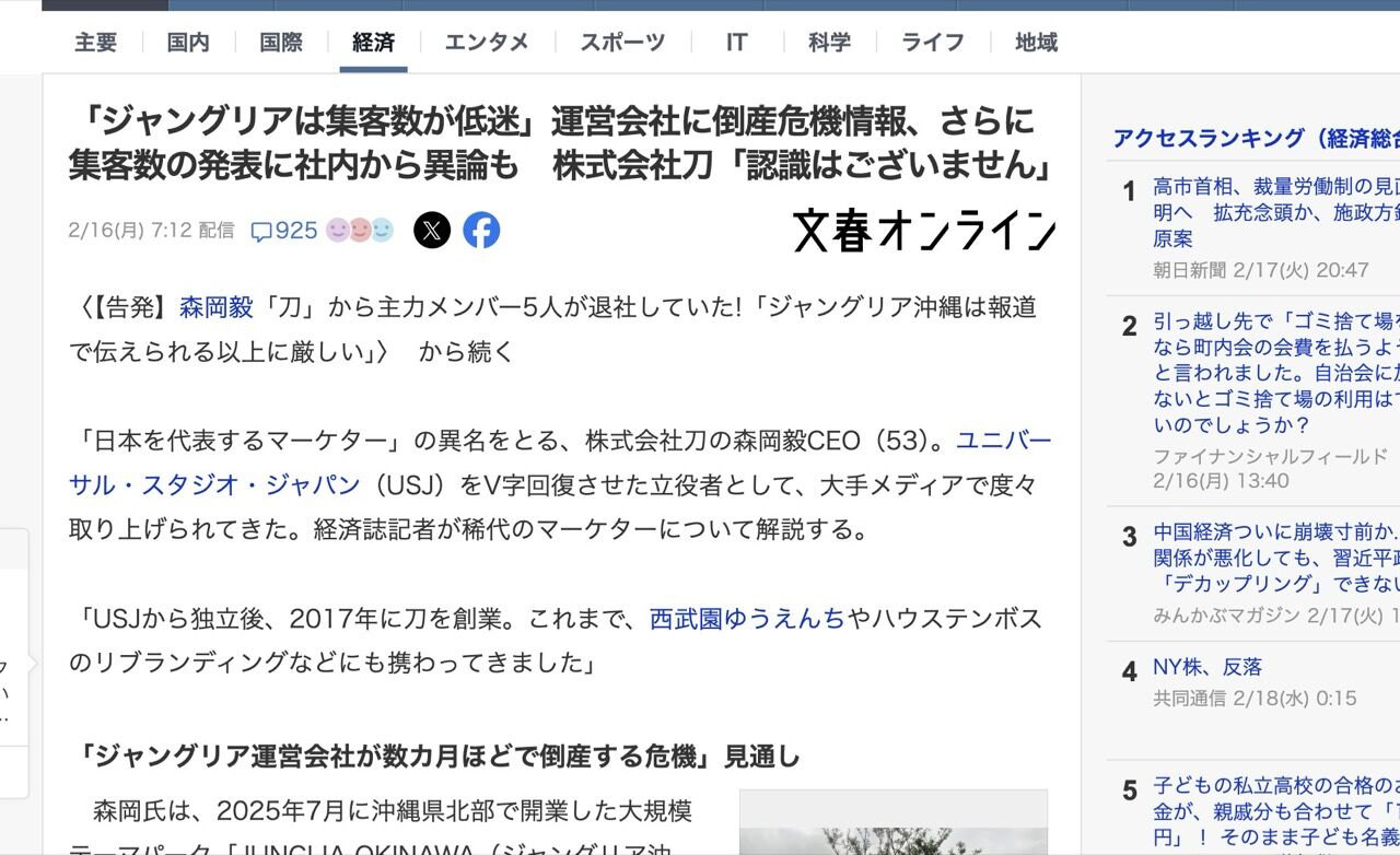 「ジャングリアは集客数が低迷しており、株式会社ジャパンエンターテイメントが、このままでは数カ月ほどで倒産する危機に直面しています。