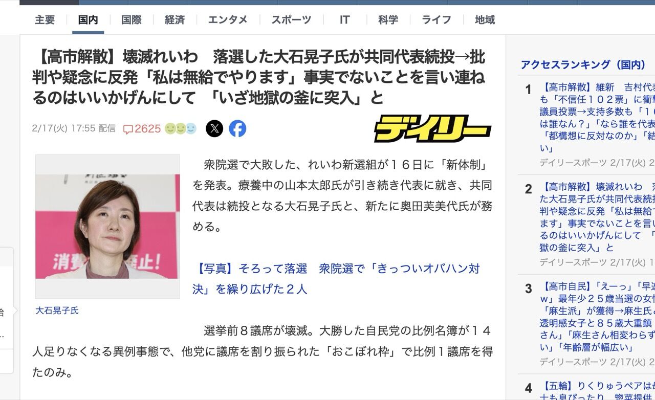 大石氏は17日の投稿で「私は無給でやりますよ。事実でないことを言い連ねるのはいいかげんにしてほしい」と投稿した。