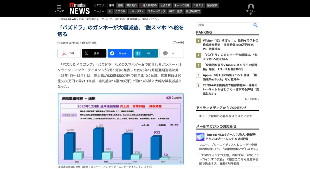 「パズル&ドラゴンズ」(パズドラ)などのスマホゲームで知られるガンホー・オンライン・エンターテイメントが2月13日に発表した2025年12月期通期連結決算(25年1月~12月)は、売上高が932億4200万円で前年比10.0%減、営業利益は50億5600万円で同71.1%減、純利益は14億700万円で同87.4%減と大幅な減収減益となった。