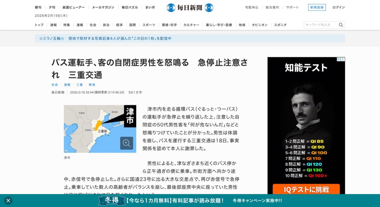 津市内を走る循環バス(ぐるっと・つーバス)の運転手が急停止を繰り返した上、注意した自閉症の50代男性客を「何が危ないんだ」などと怒鳴りつけていたことが分かった。男性は体調を崩し、バスを運行する三重交通は18日、事実関係を認めて本人に謝罪した。