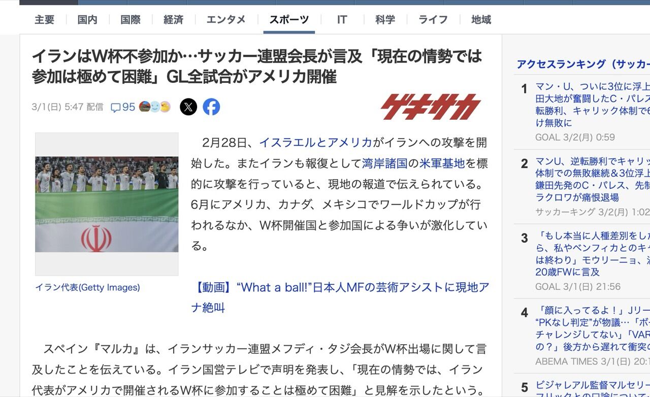 2月28日、イスラエルとアメリカがイランへの攻撃を開始した。またイランも報復として湾岸諸国の米軍基地を標的に攻撃を行っていると、現地の報道で伝えられている。6月にアメリカ、カナダ、メキシコでワールドカップが行われるなか、W杯開催国と参加国による争いが激化している。