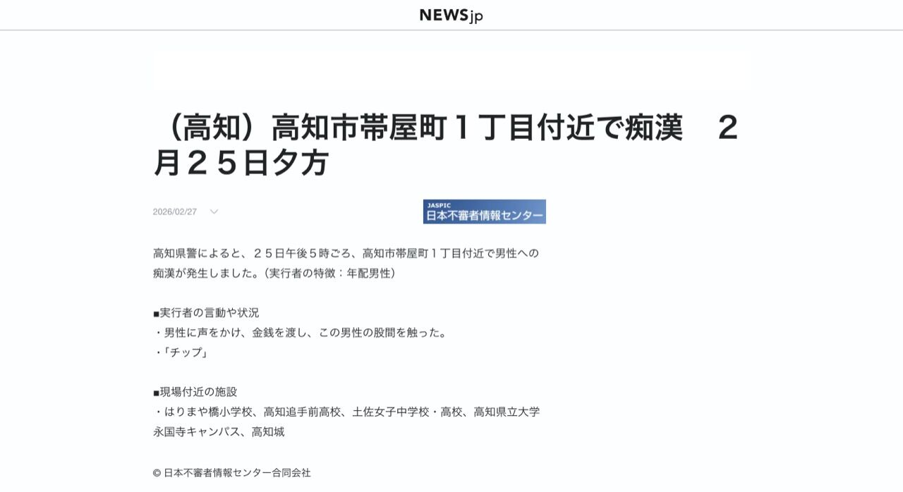高知県警によると、25日午後5時ごろ、高知市帯屋町1丁目付近で男性への痴漢が発生しました。(実行者の特徴:年配男性)