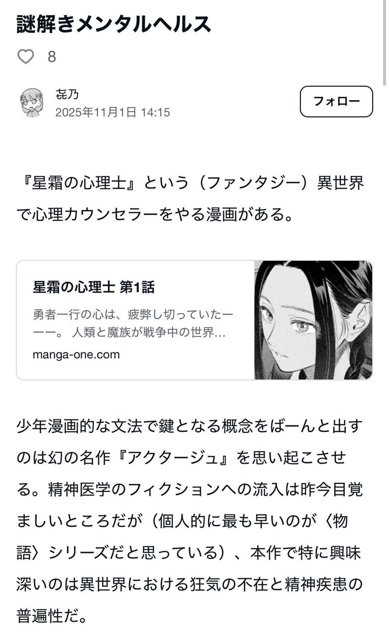 その上で「以下は、八ツ波樹氏の了承のもと公表するものです。八ツ波樹氏は2020年8月に強制わいせつ容疑で逮捕・起訴され、その後、有罪判決(懲役1年6か月、執行猶予3年)を受けた人物です。編集部はその事実を把握した上で、『星霜の心理士』の原作者として起用の判断を行いました。起用に当たっては、判決の確定及び執行猶予期間の満了を確認し、事件に対する反省の姿勢や再発防止への取り組み、専門家による社会復帰支援状況について確認を行い、編集部内で検討しました」として、起用の経緯を記した。