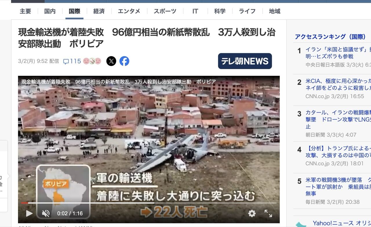 現金輸送機が着陸失敗 96億円相当の新紙幣散乱 3万人殺到し治安部隊出動 ボリビア