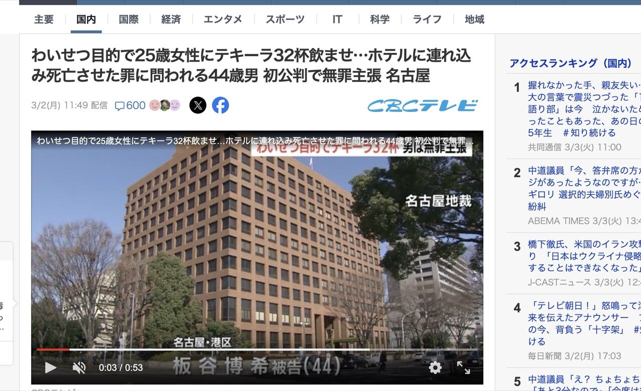 わいせつ目的で25歳女性にテキーラ32杯飲ませ…ホテルに連れ込み死亡させた罪に問われる44歳男 初公判で無罪主張 名古屋(CBCテレビ) - Yahoo!ニュース