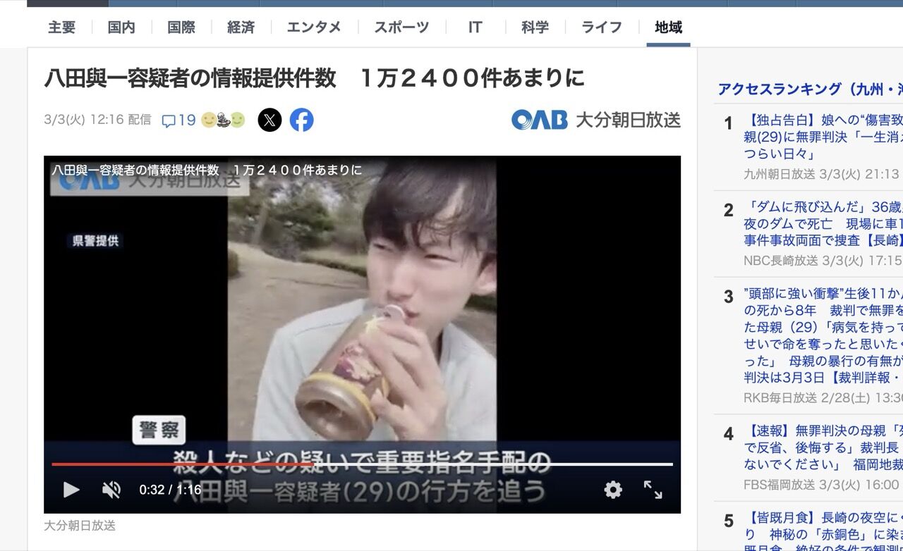 - 【おい八田】ひき逃げ重要指名手配の八田與一容疑者(27) 目撃情報「関東」で急増