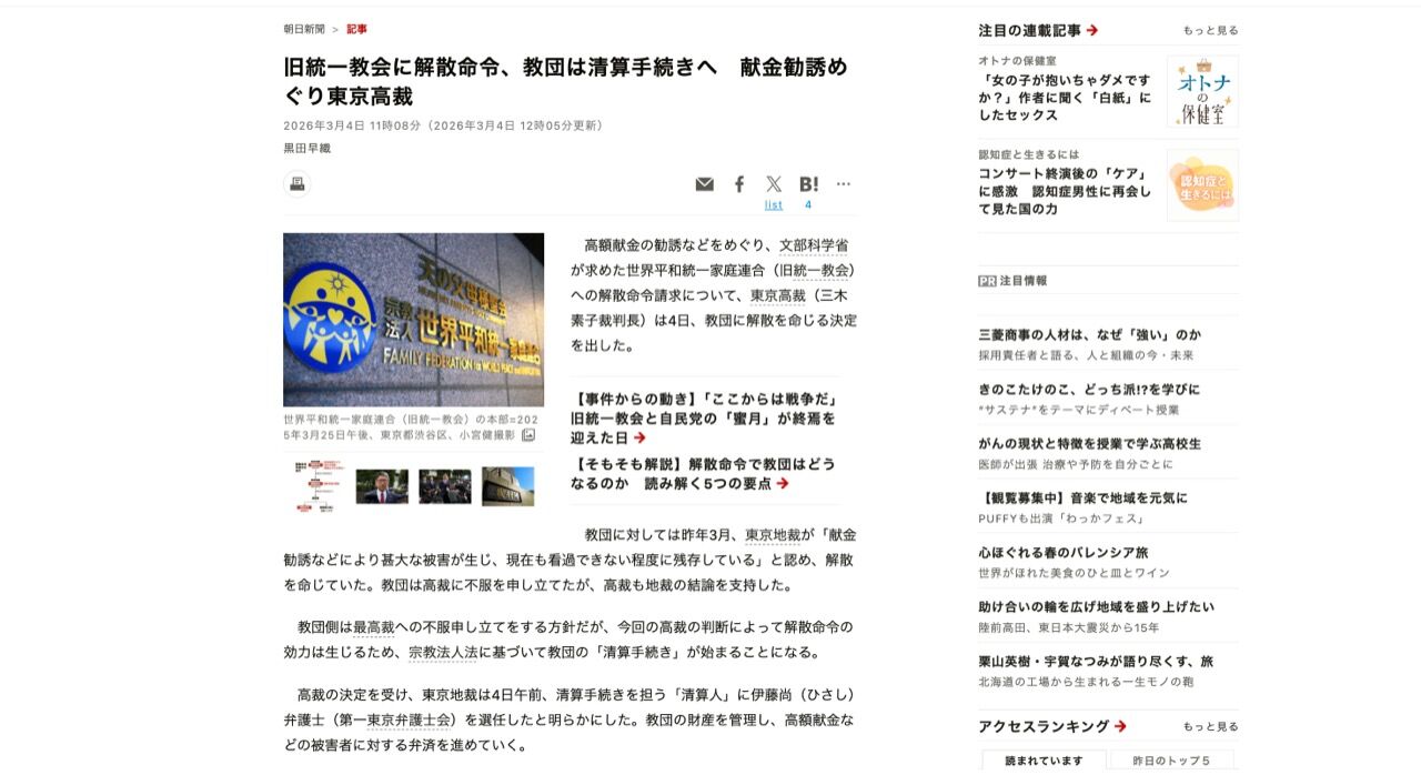 旧統一教会に解散命令、教団は清算手続きへ 献金勧誘めぐり東京高裁 [旧統一教会問題]:朝日新聞
