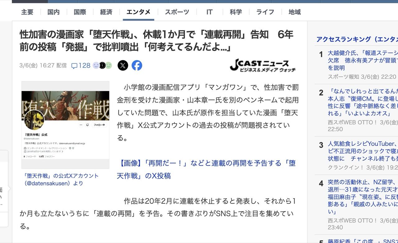 小学館の漫画配信アプリ「マンガワン」で、性加害で罰金刑を受けた漫画家・山本章一氏を別のペンネームで起用していた問題で、山本氏が原作を担当していた漫画「堕天作戦」X公式アカウントの過去の投稿が問題視されている。