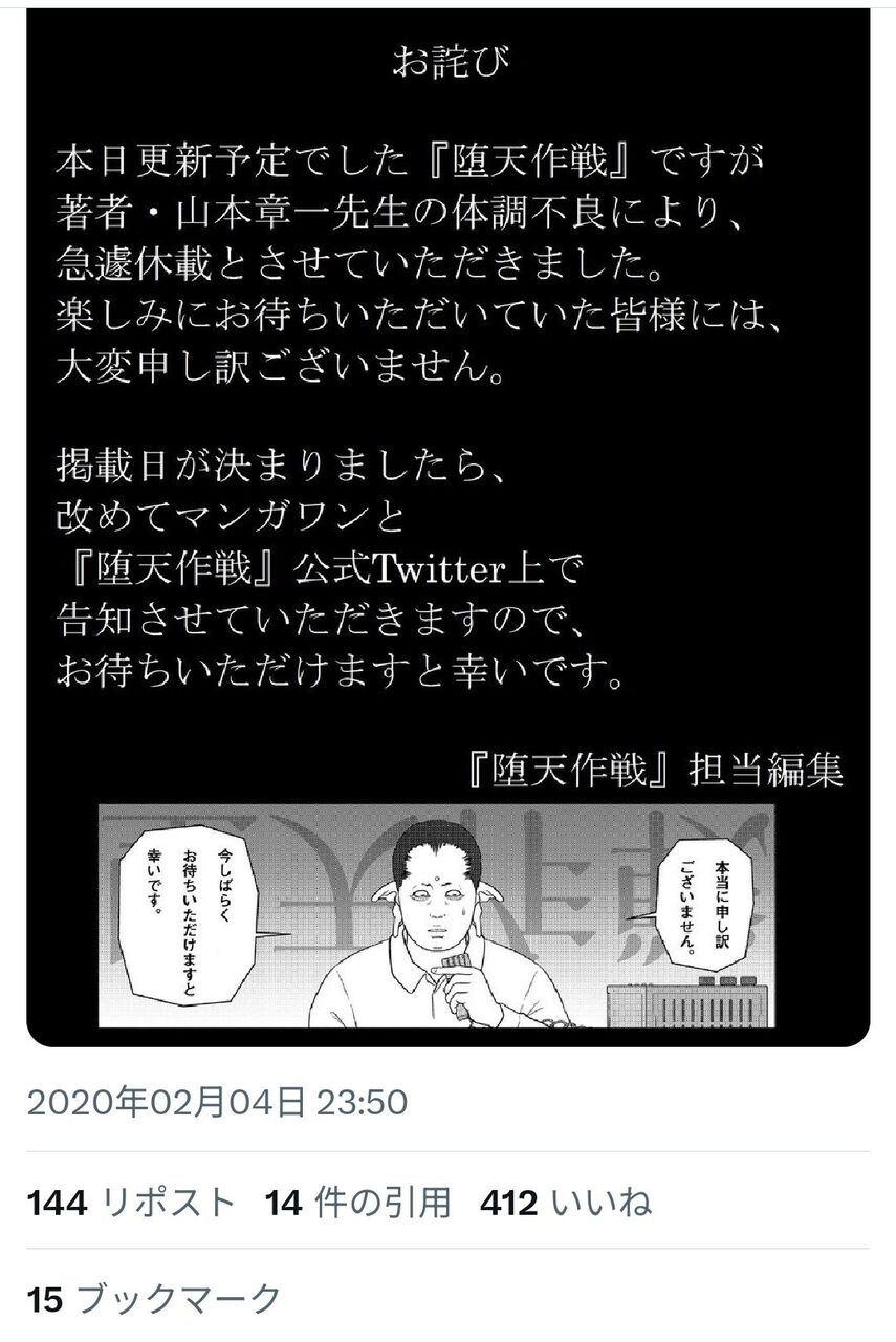 SNS上で注目を集めているのは、「堕天作戦」の公式Xアカウントで、20年2月28日に告知された「連載の再開」の投稿だ。同年2月4日に山本氏の「体調不良」で急きょ休載すると発表されてから、1か月も経っていないタイミングでの報告だった。
