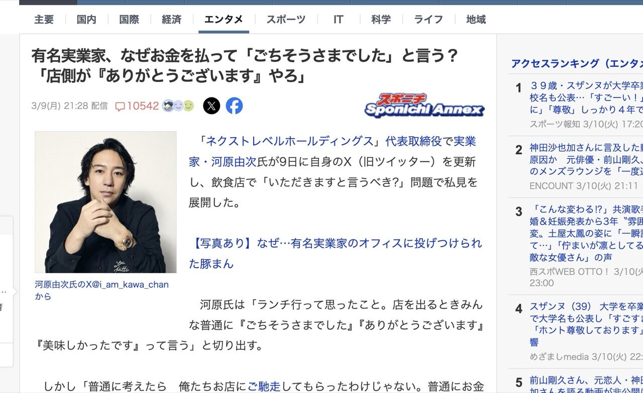 「ネクストレベルホールディングス」代表取締役で実業家・河原由次氏が9日に自身のX(旧ツイッター)を更新し、飲食店で「いただきますと言うべき?」問題で私見を展開した。
