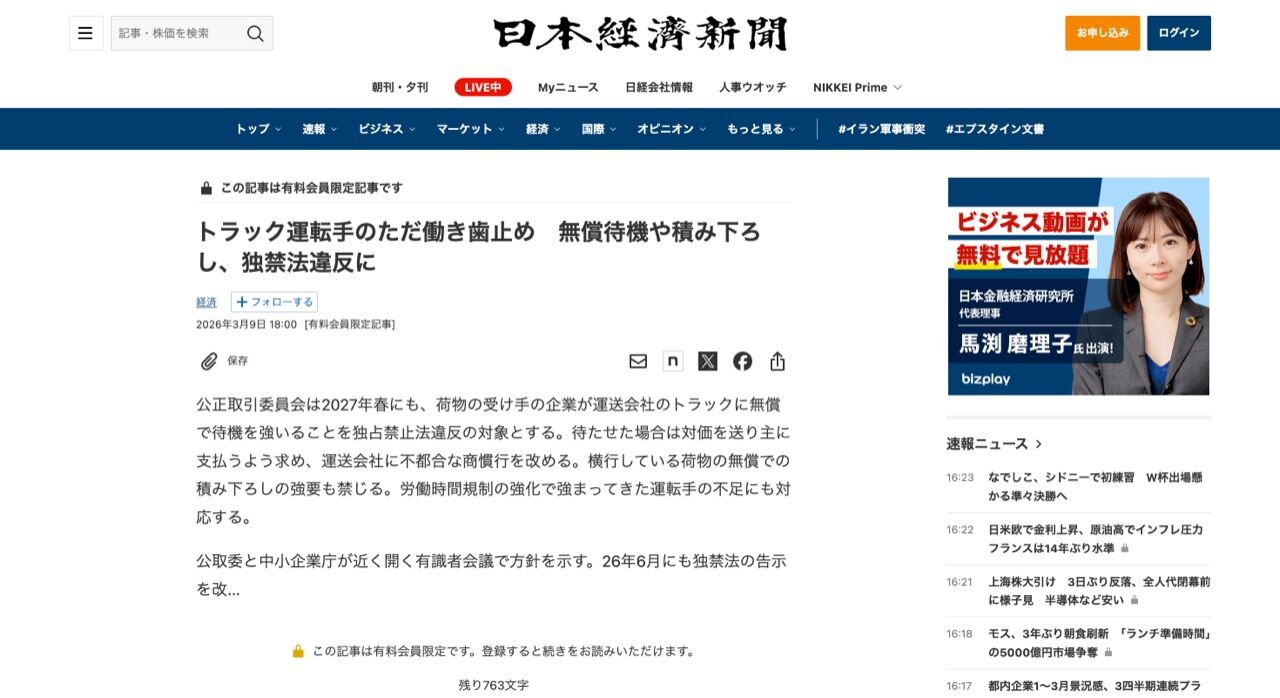 トラック運転手のただ働き歯止め 無償待機や積み下ろし、独禁法違反に