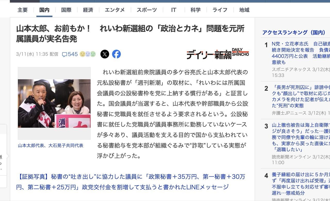 れいわ新選組前衆院議員の多ケ谷亮氏と山本太郎代表の元私設秘書が「週刊新潮」の取材に、「れいわには所属国会議員の公設秘書枠を党に上納する慣行がある」と証言した。国会議員が当選すると、山本代表や幹部職員から公設秘書に党職員を就任させるよう要求されるという。
