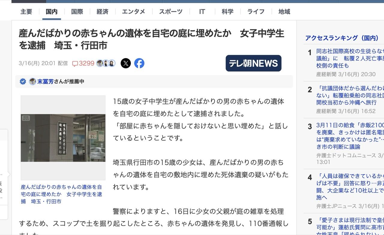 埼玉県行田市の15歳の少女は、産んだばかりの男の赤ちゃんの遺体を自宅の敷地内に埋めた死体遺棄の疑いがもたれています。