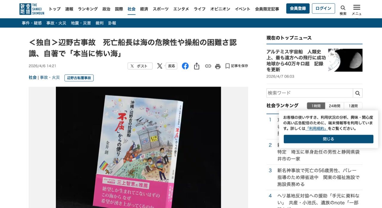 <独自>辺野古事故 死亡船長は海の危険性や操船の困難さ認識、自著で「本当に怖い海」