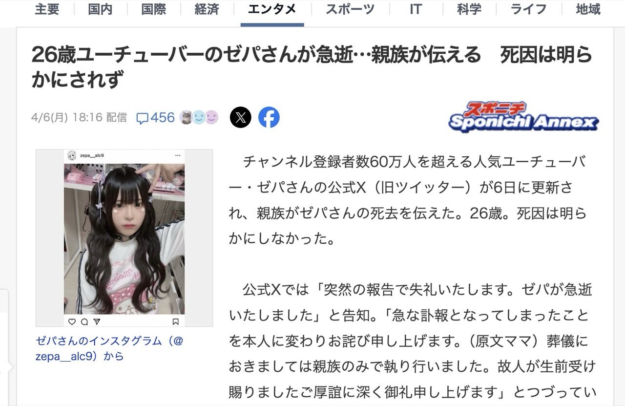 チャンネル登録者数60万人を超える人気ユーチューバー・ゼパさんの公式X(旧ツイッター)が6日に更新され、親族がゼパさんの死去を伝えた。26歳。死因は明らかにしなかった。